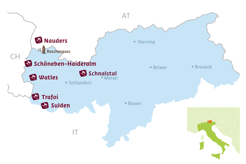 Die Ferienregion Vinschgau lässt für Winterurlauber keine Wünsche offen. Skifahrer und Snowboarder, Langläufer und Rodler erwartet ein abwechslungsreiches und vielseitiges Angebot an Skipisten aller Schwierigkeitsgrade. Sportliche Herausforderungen und viel Spaß versprechen die Fun- und Snowparks, Rodelbahnen, Loipen und Höhenloipen. Skitourengeher erklimmen sonnige Höhenziele mit großartigem Bergpanorama. Biathlon Fans und Eiskletterer zieht es ins Martelltal oder ins hochalpine Sulden. Rund um den zugefrorenen Reschensee und Haidersee, treffen sich Eisläufer, Eissegler und Snowkiter.